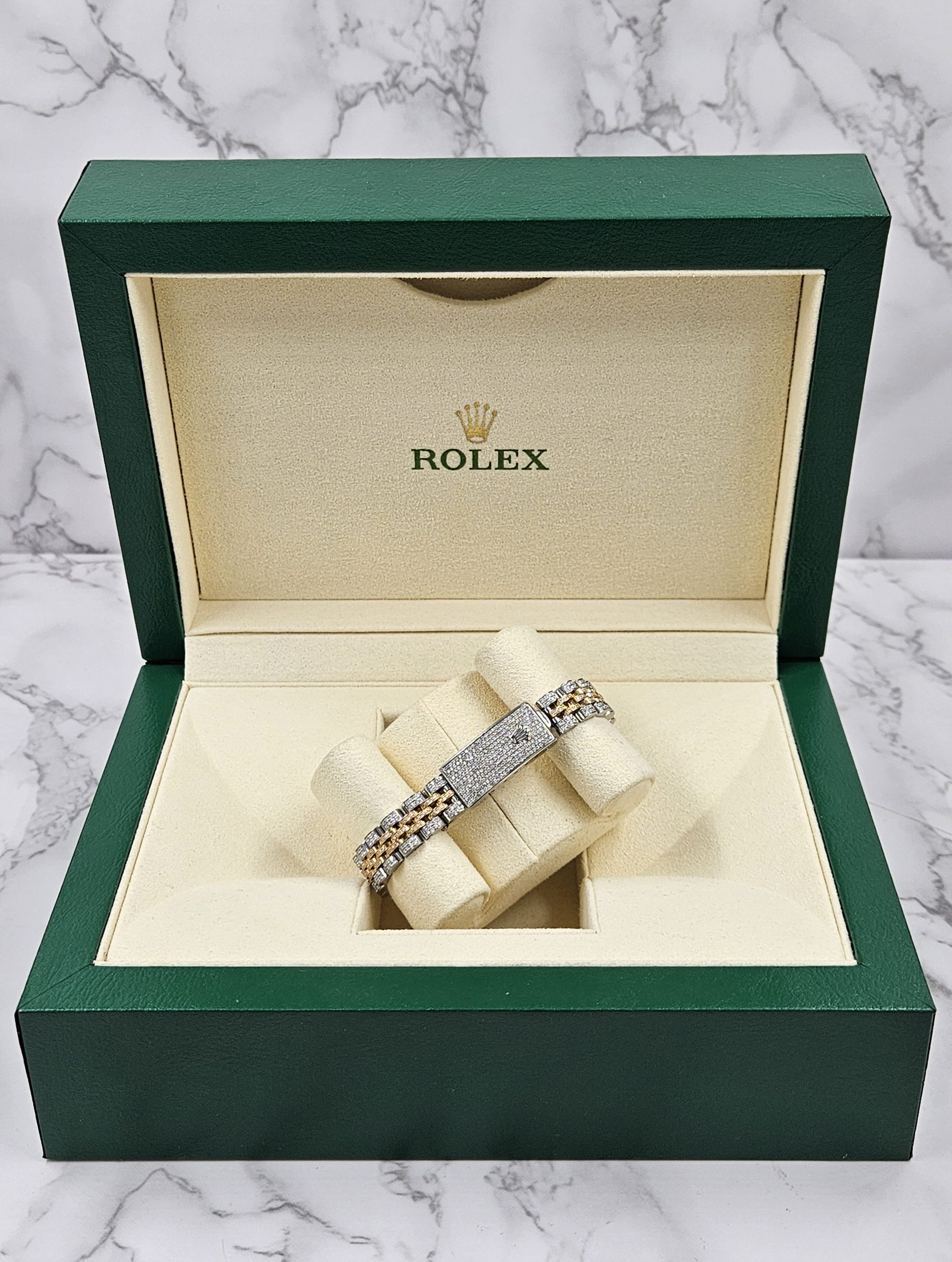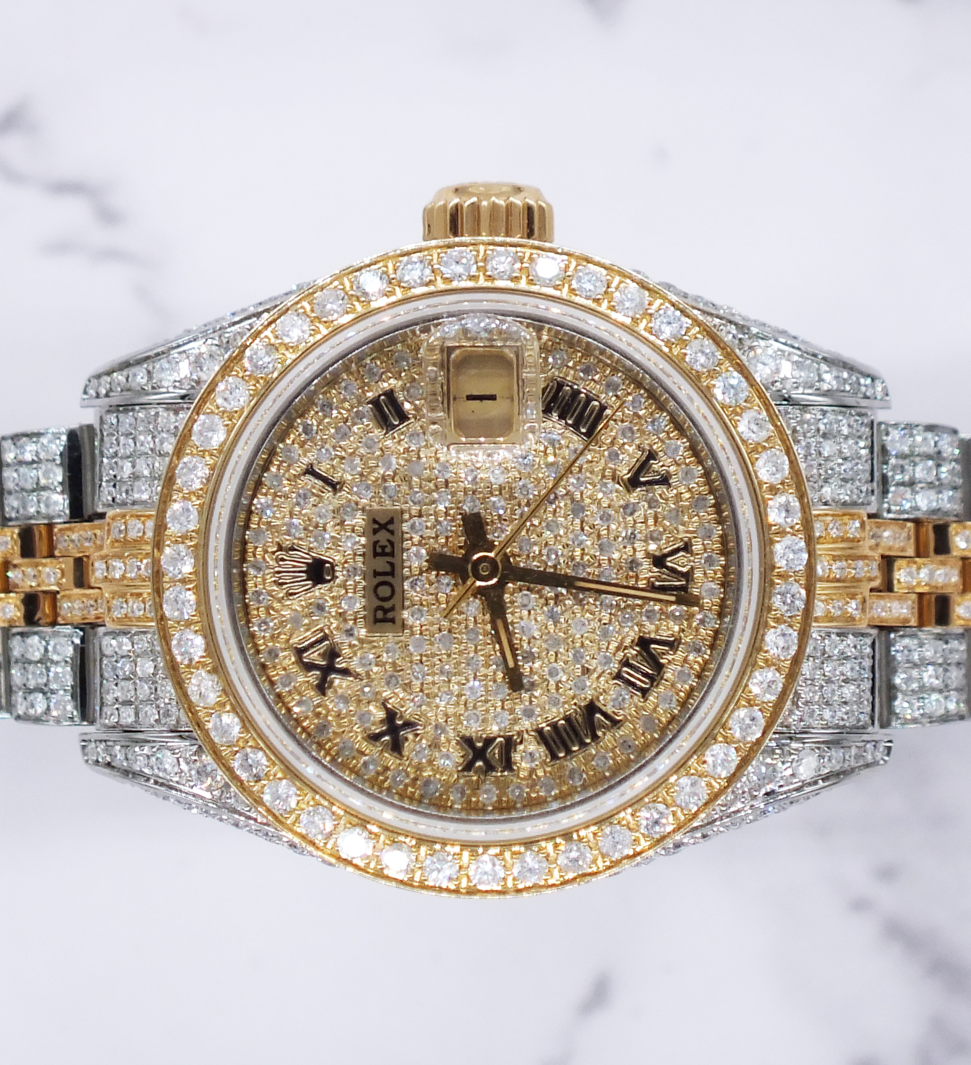 Custom diamond bezel and diamond shoulders and Bracelet – a huge look for the money!