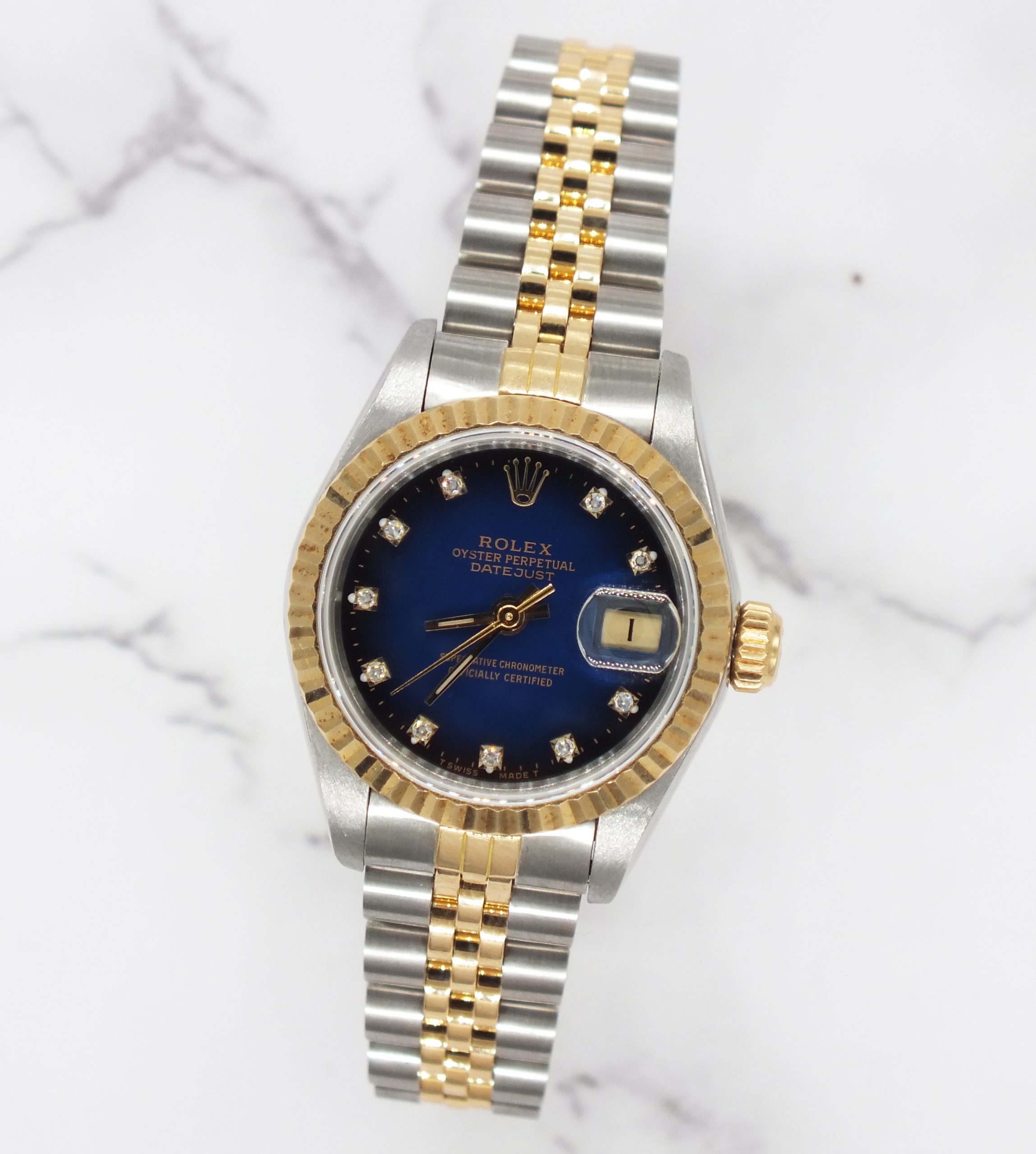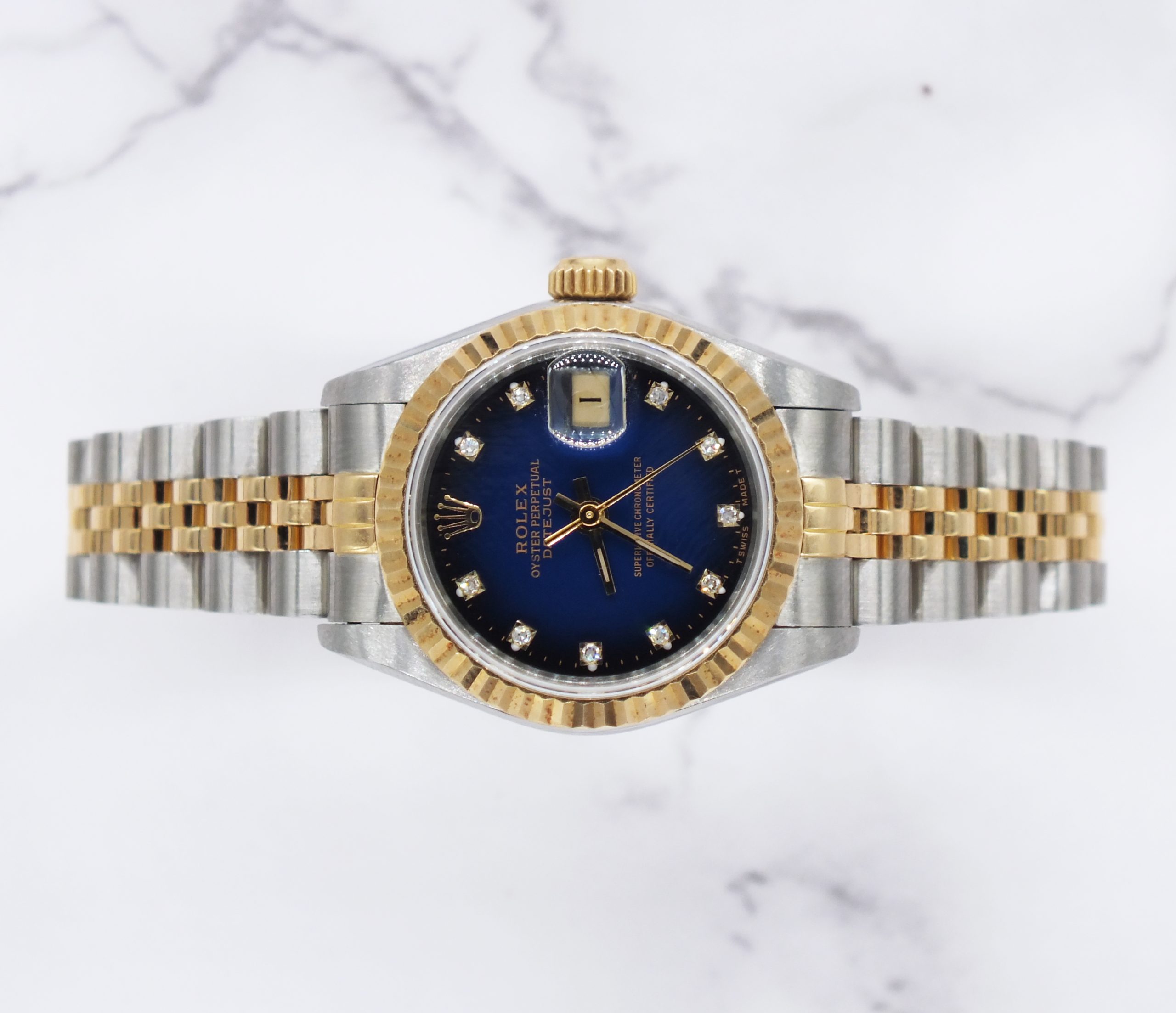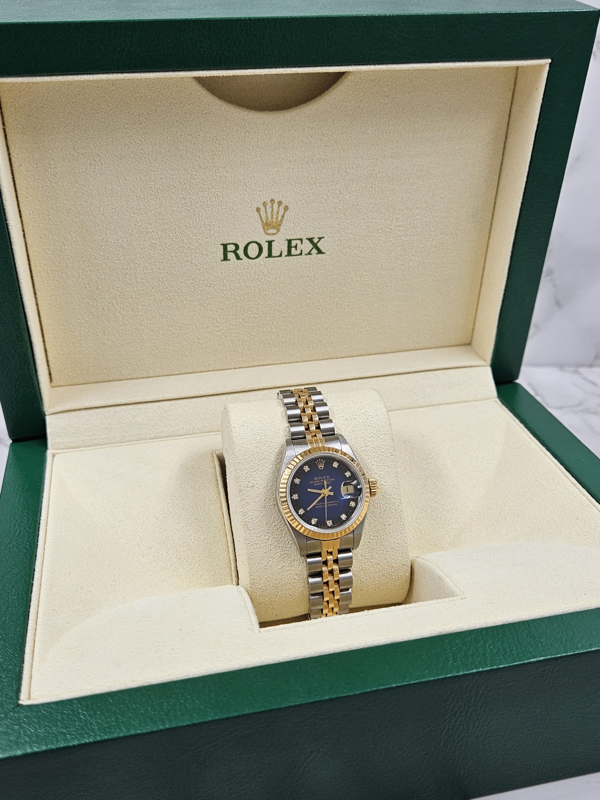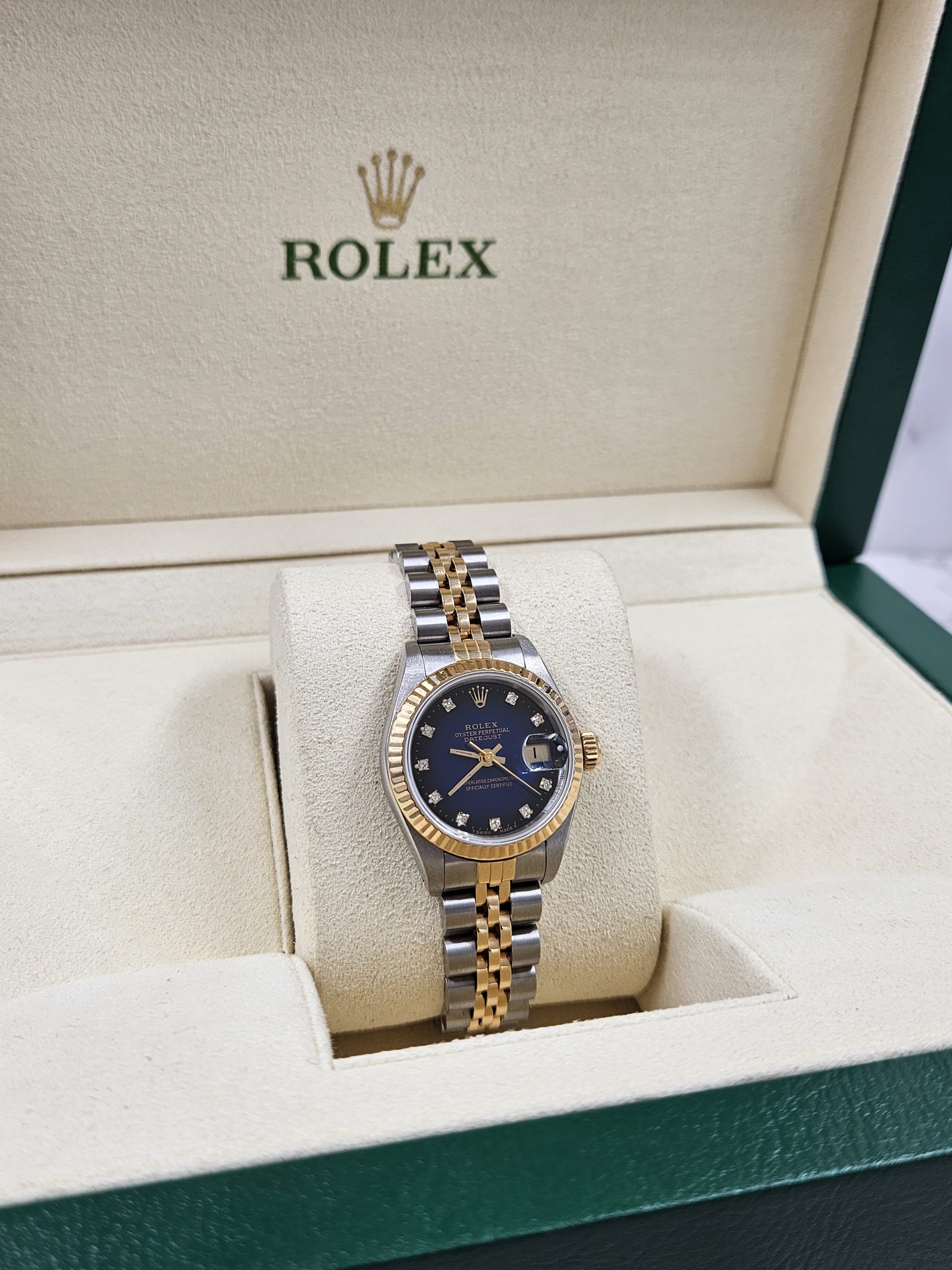 Stunning Ladies Steel & Gold Rolex Datejust with Factory Blue Vignette Diamond Dial – Box and Papers