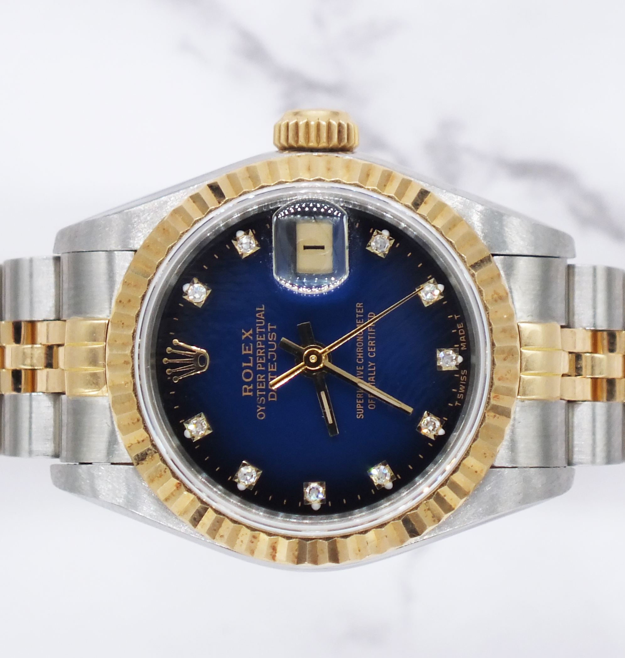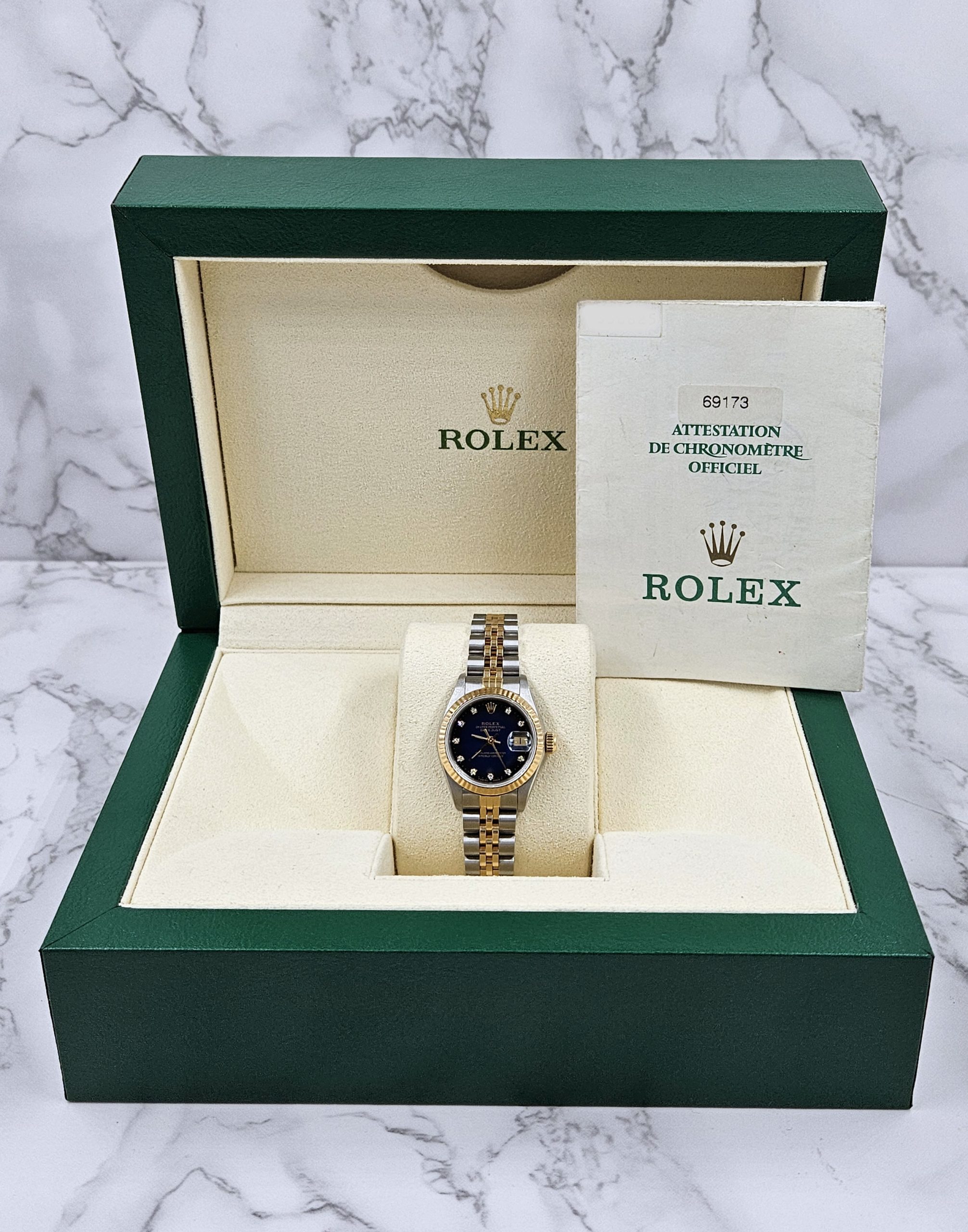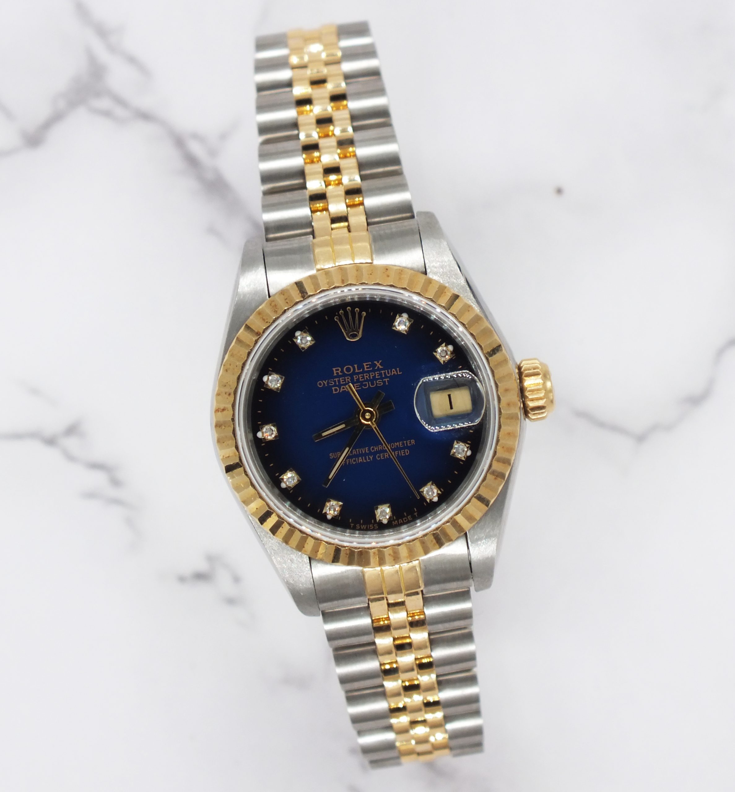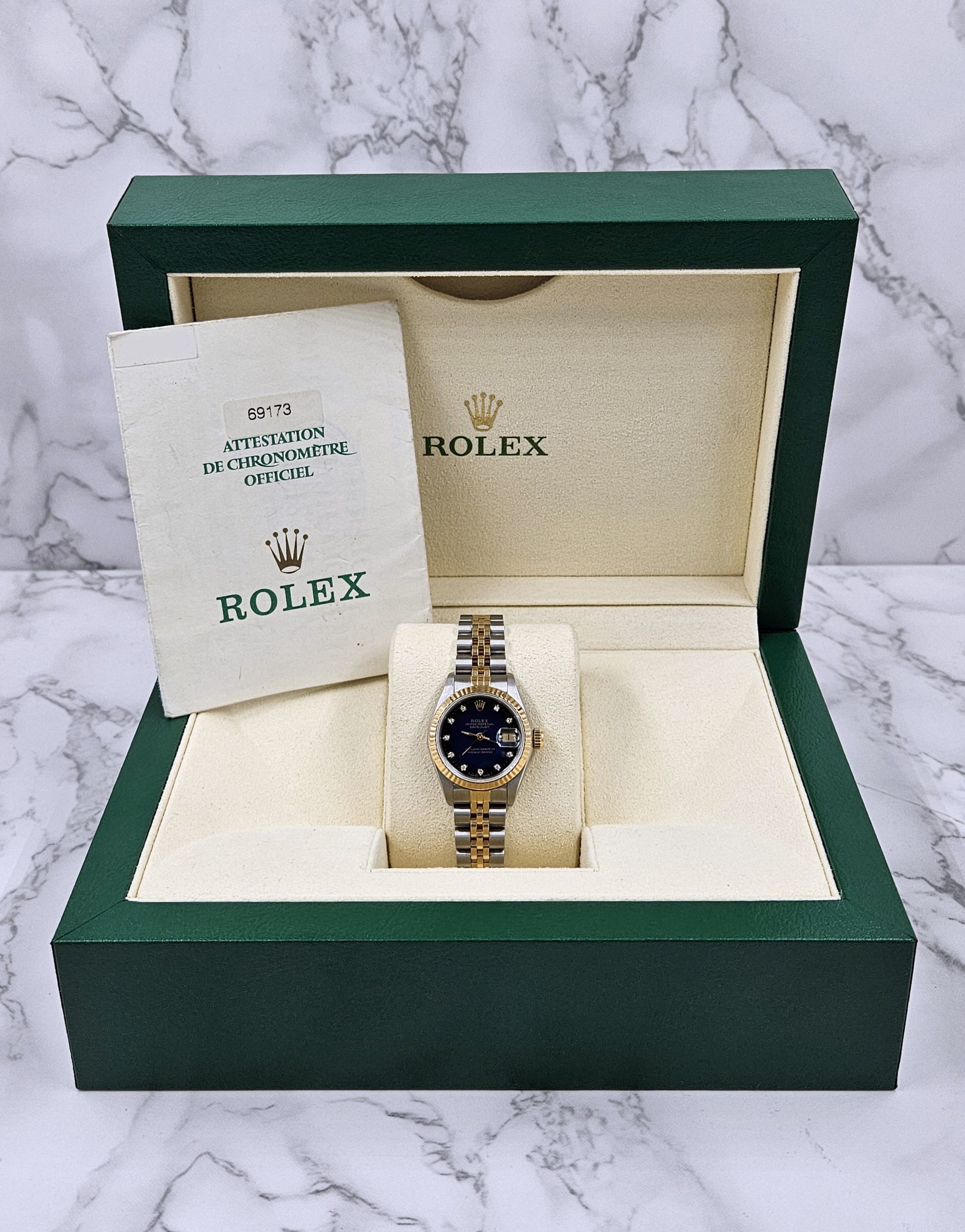 Stunning Ladies Steel & Gold Rolex Datejust with Factory Blue Vignette Diamond Dial – Box and Papers