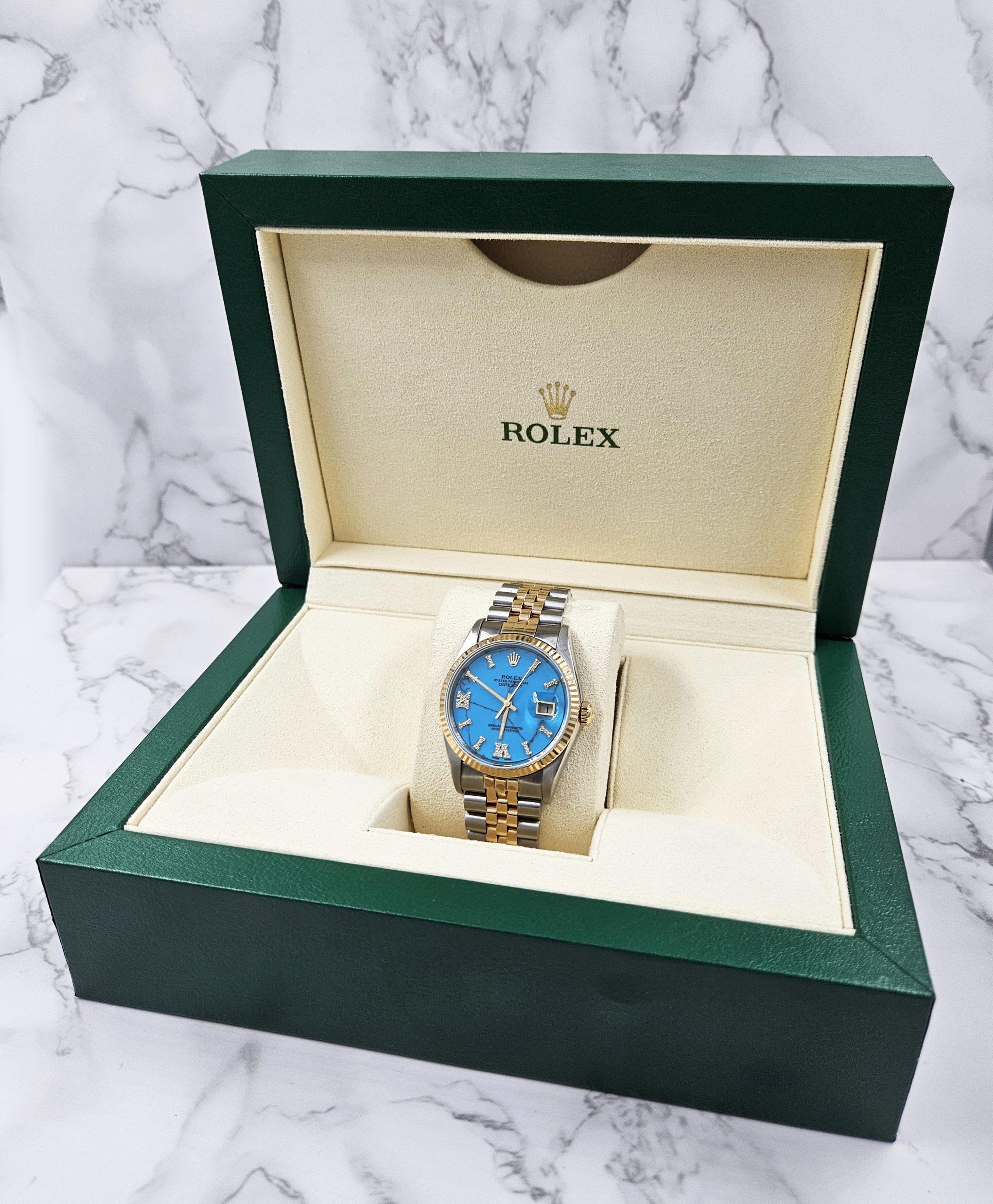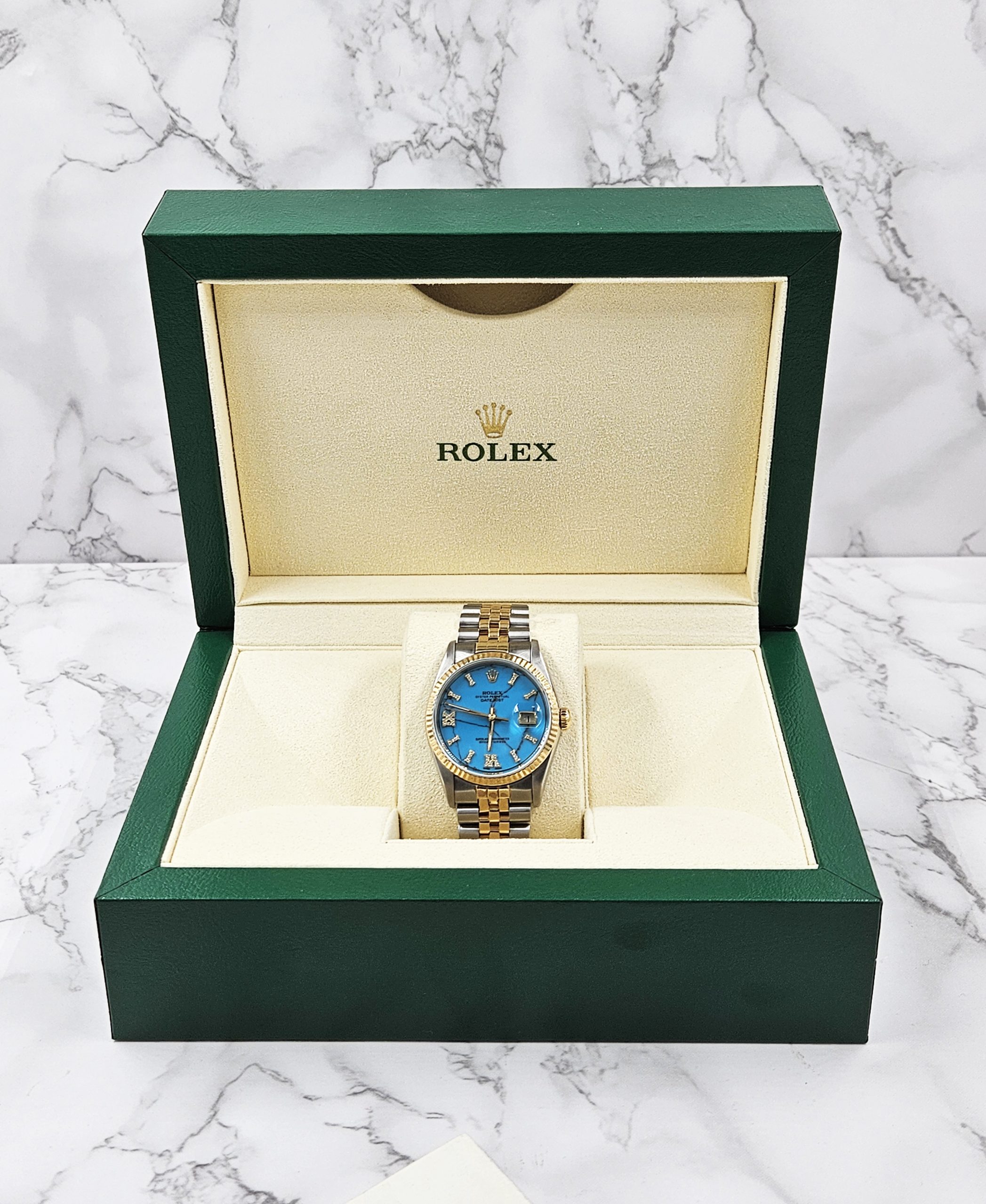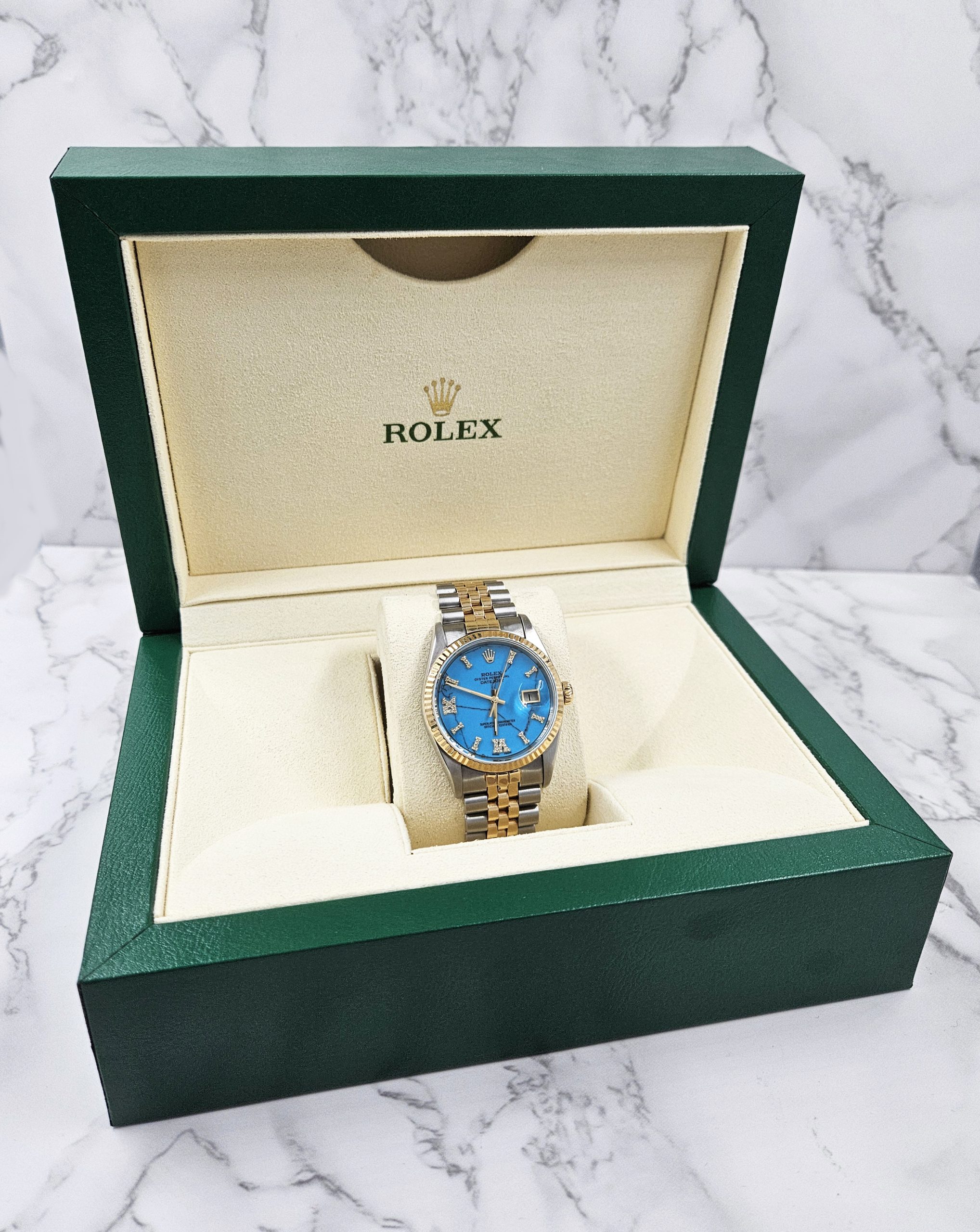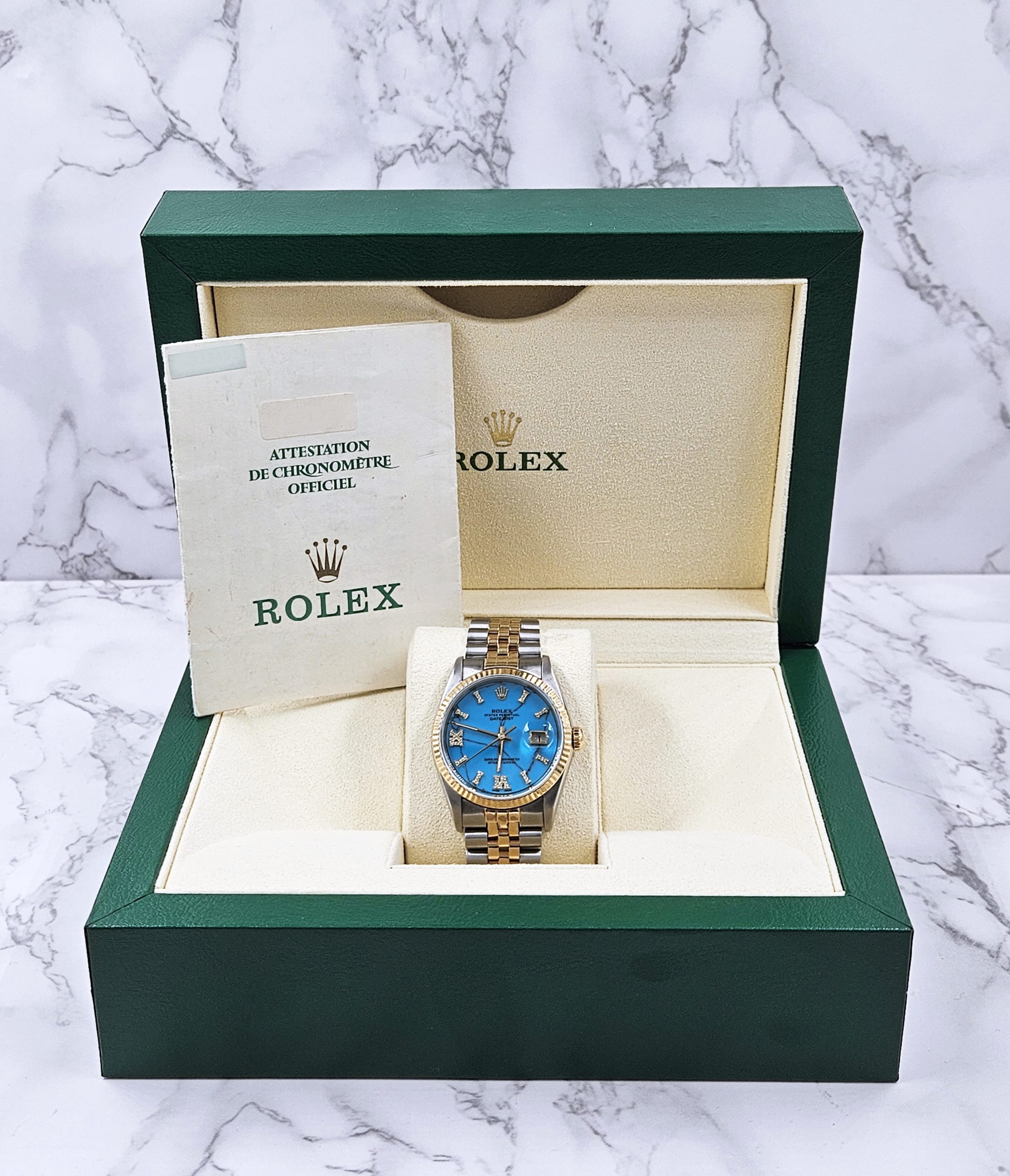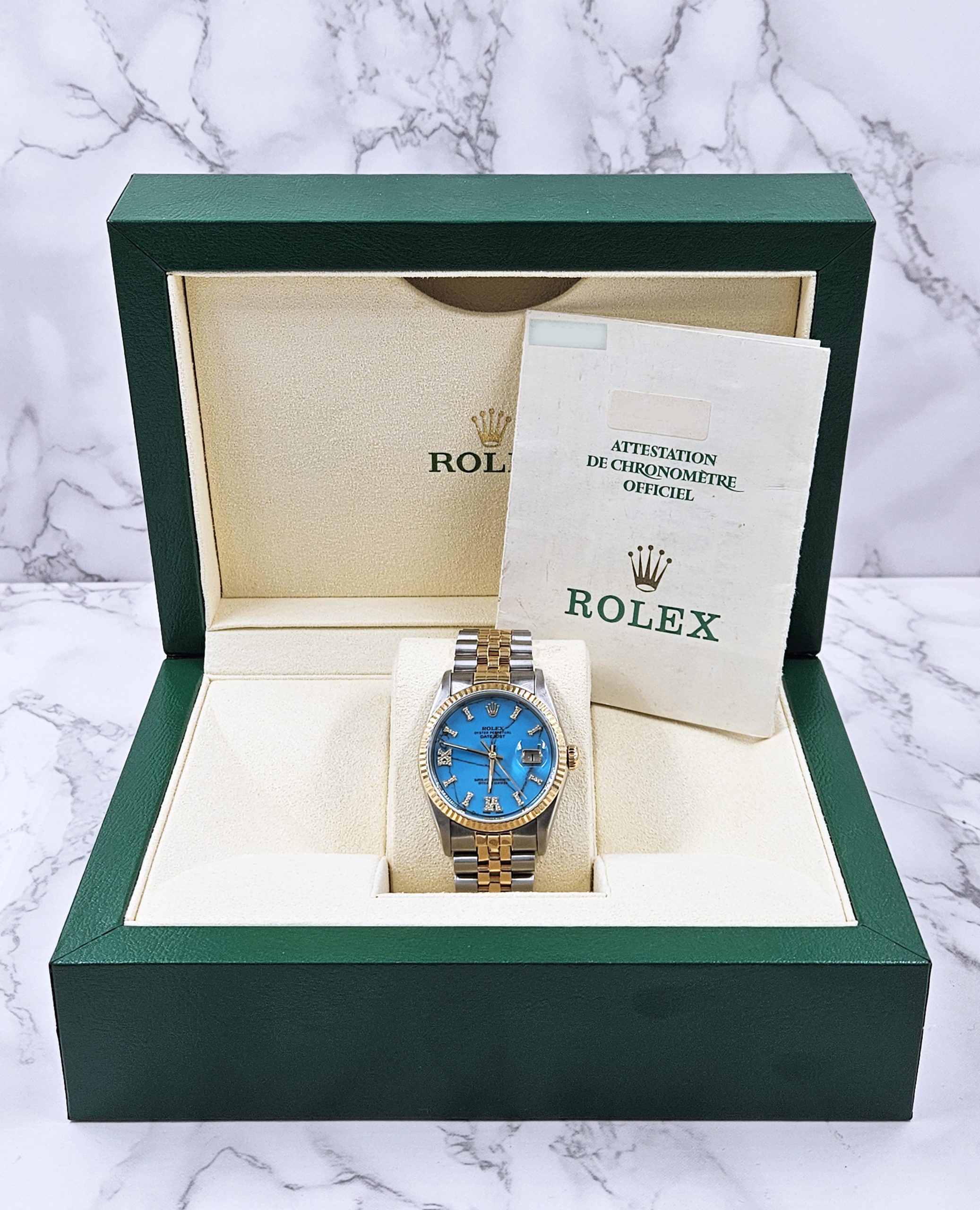 Men’s Steel & Gold Rolex Datejust 16233, Blue Stone Diamond Dial – Box & Papers