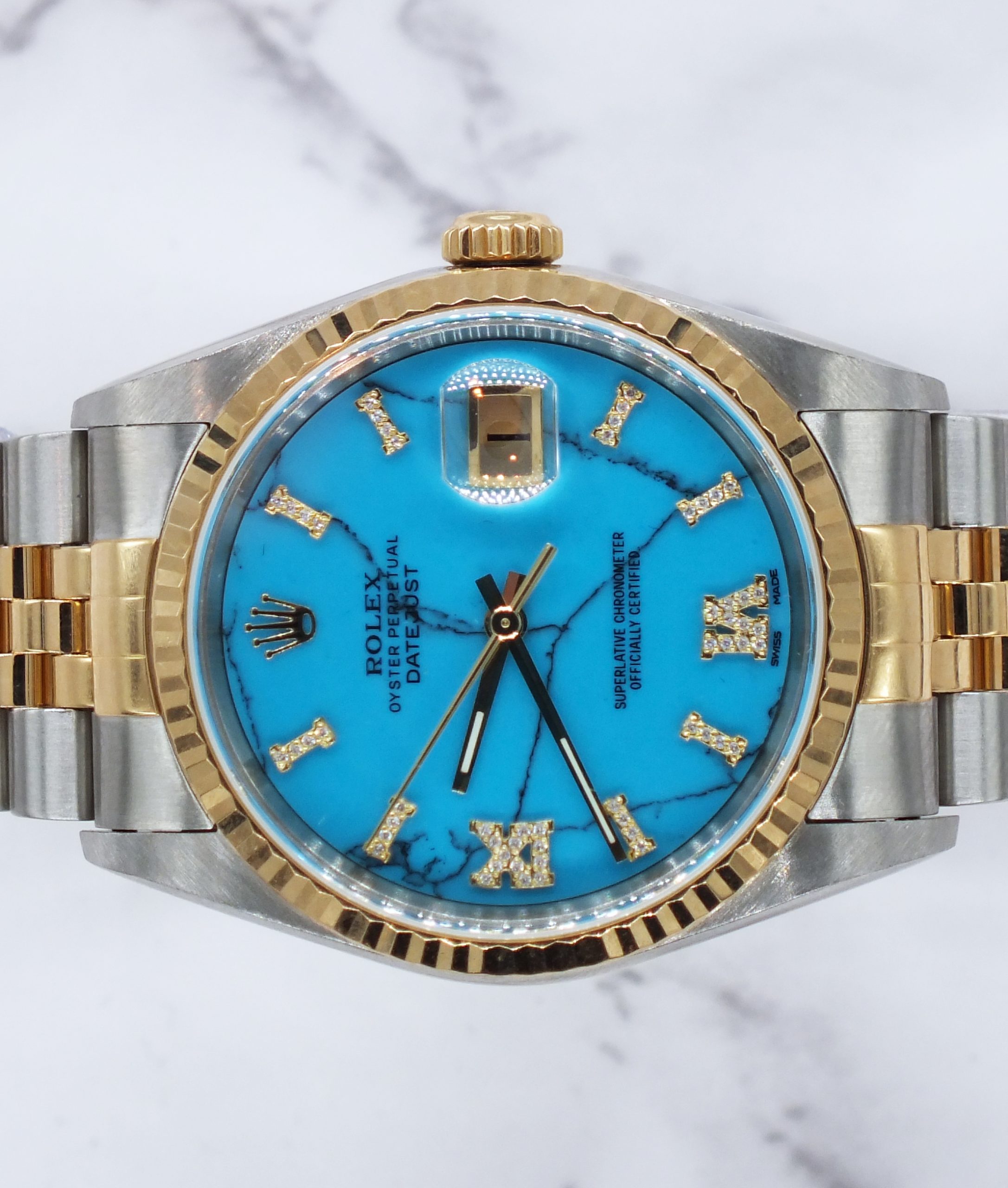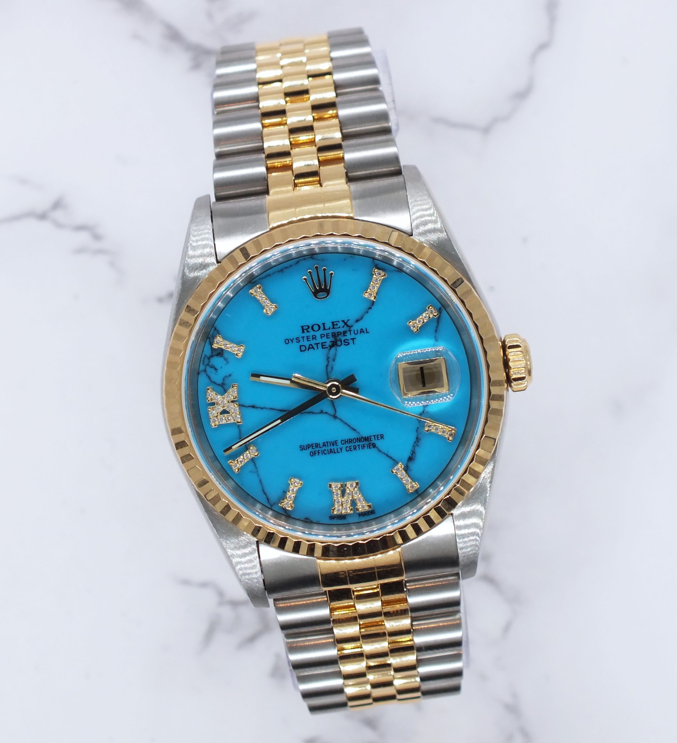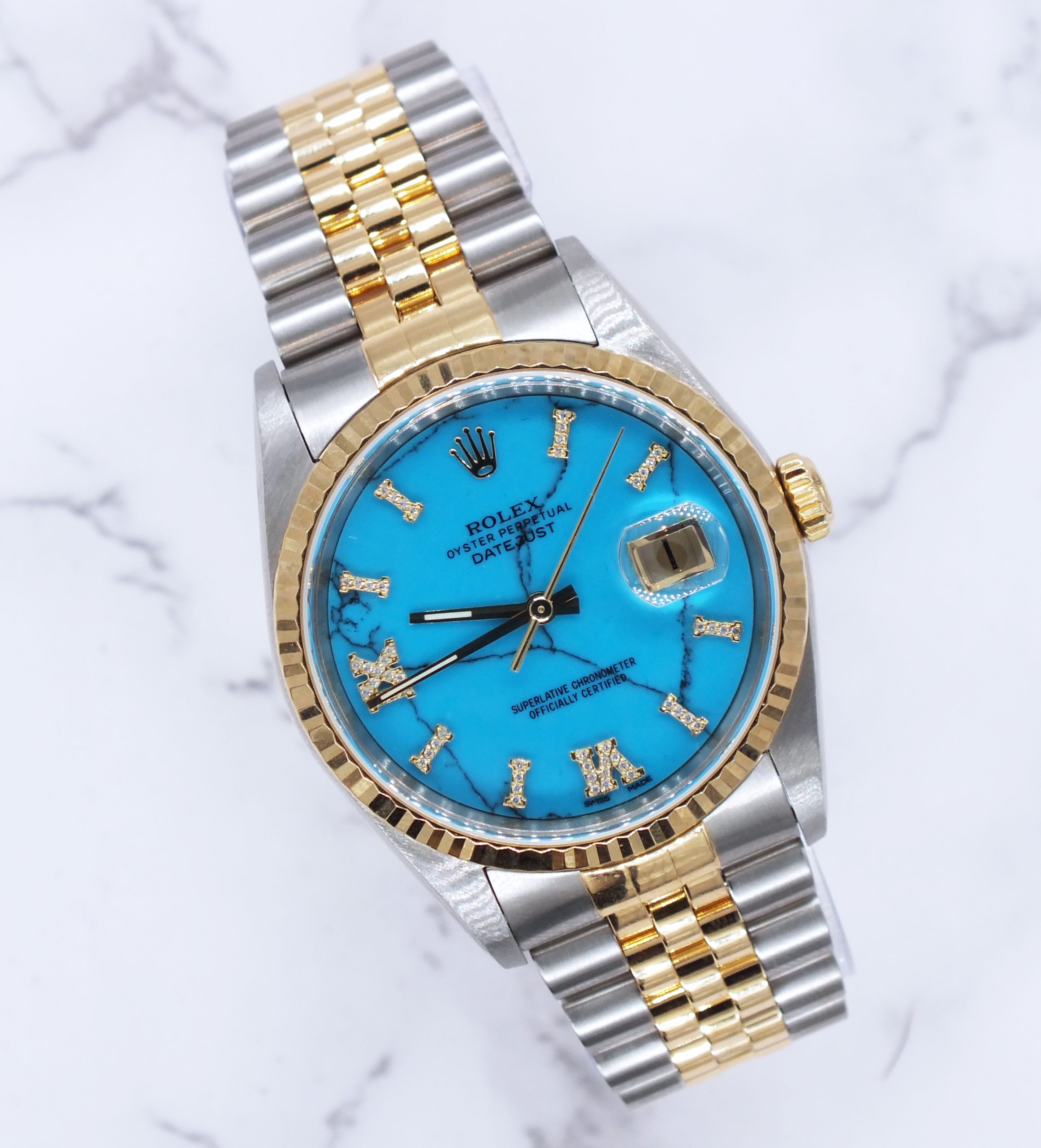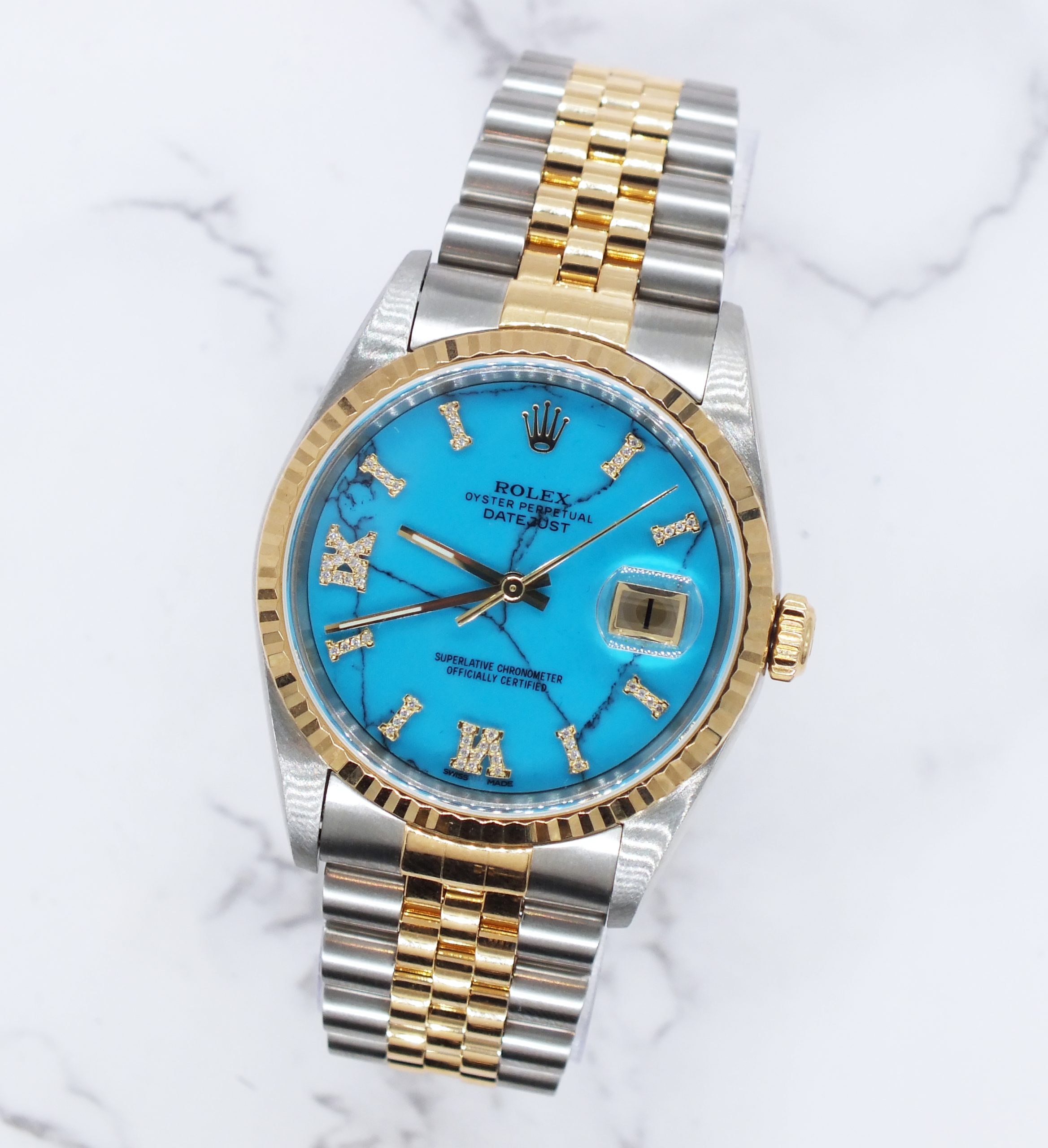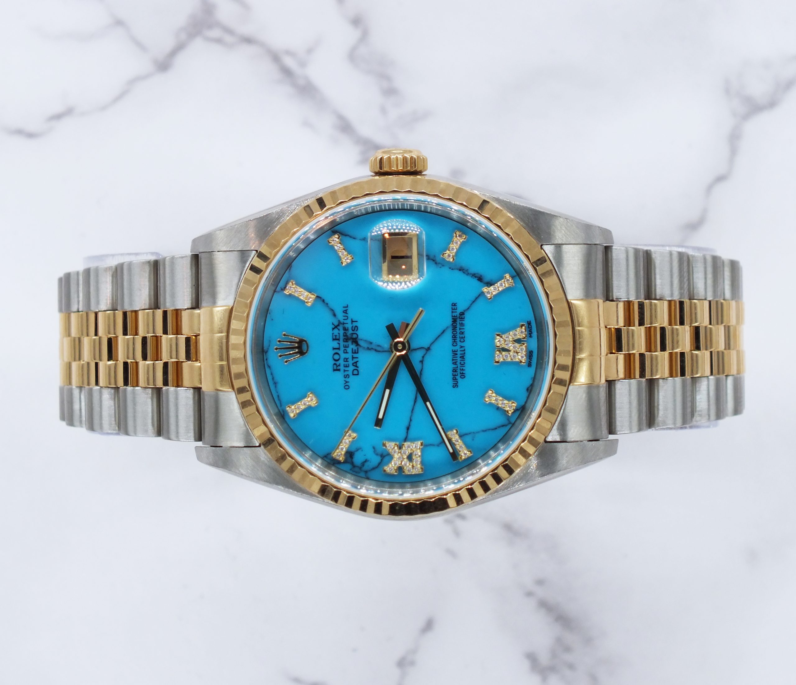 Men’s Steel & Gold Rolex Datejust 16233, Blue Stone Diamond Dial – Box & Papers